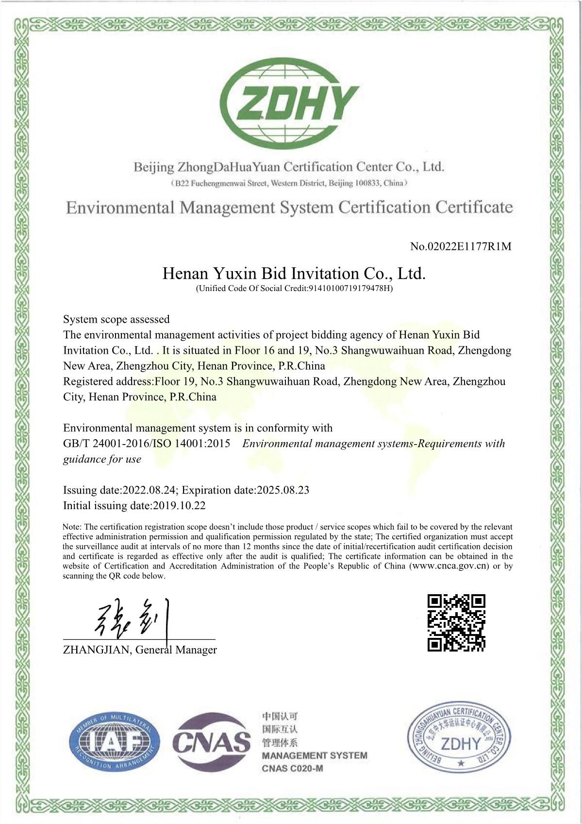 河南豫信招標(biāo)有限責(zé)任公司OHSMSSMS中文證書 -