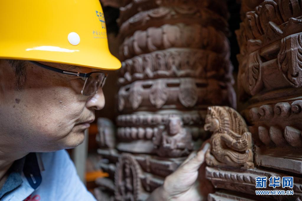 2019年10月10日,在尼泊爾加德滿都杜巴廣場(chǎng),中國派出的文物修復(fù)隊(duì)技術(shù)主管周建國在九層神廟修復(fù)現(xiàn)場(chǎng)查看一個(gè)修復(fù)好的文物。新華社記者 王婧嬙 攝