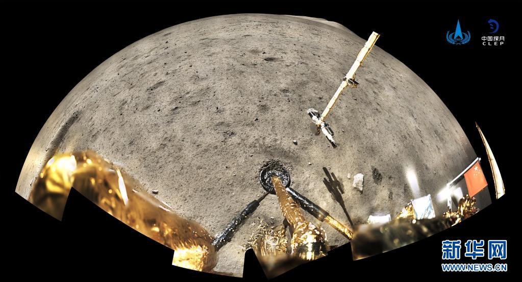 2020年12月4日,國家航天局公布了探月工程嫦娥五號探測器在月球表面國旗展示的照片。嫦娥五號著陸器和上升器組合體全景相機環(huán)拍成像,五星紅旗在月面成功展開,此外圖像上方可見已完成表取采樣的機械臂及采樣器。新華社發(fā)(國家航天局供圖)