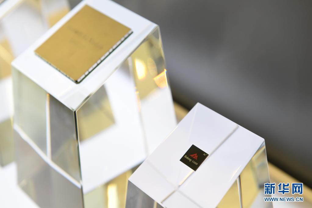 2019年10月23日拍攝的巴龍5000芯片以及搭載該芯片的5G工業(yè)模組。新華社記者 毛思倩 攝