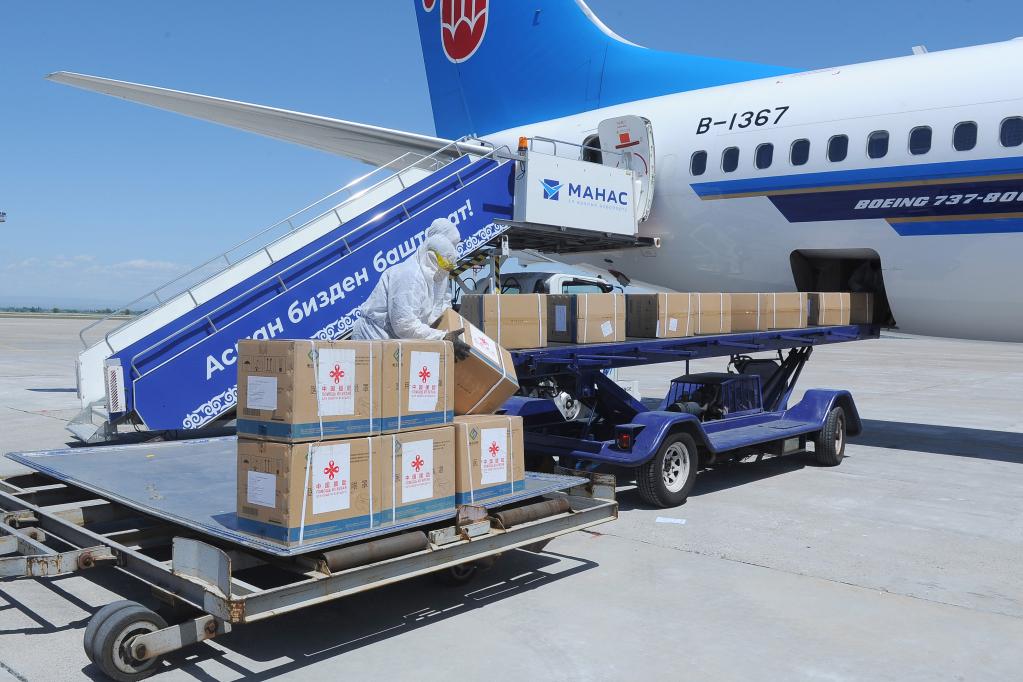 2020年5月11日,在吉爾吉斯斯坦首都比什凱克,中國(guó)政府第二批援吉抗疫醫(yī)療防護(hù)物資抵達(dá)瑪納斯國(guó)際機(jī)場(chǎng)。新華社發(fā)(吉爾吉斯斯坦政府新聞局供圖)