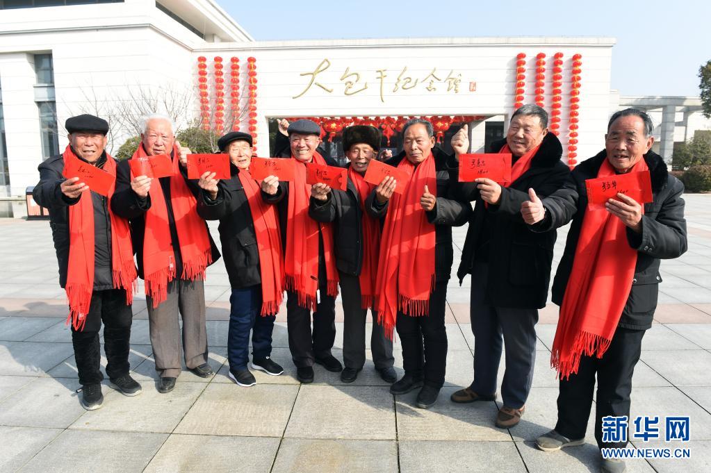 2月3日,在安徽省滁州市鳳陽縣小崗村,8位“大包干”帶頭人在大包干紀念館前展示自家領(lǐng)取的集體經(jīng)濟收益股權(quán)分紅。新華社記者 周牧 攝
