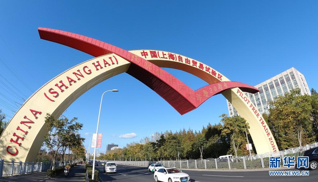 位于上海浦東新區(qū)楊高北路上的中國(上海)自由貿(mào)易試驗(yàn)區(qū)標(biāo)志門(2020年11月11日攝)。新華社記者 方喆 攝