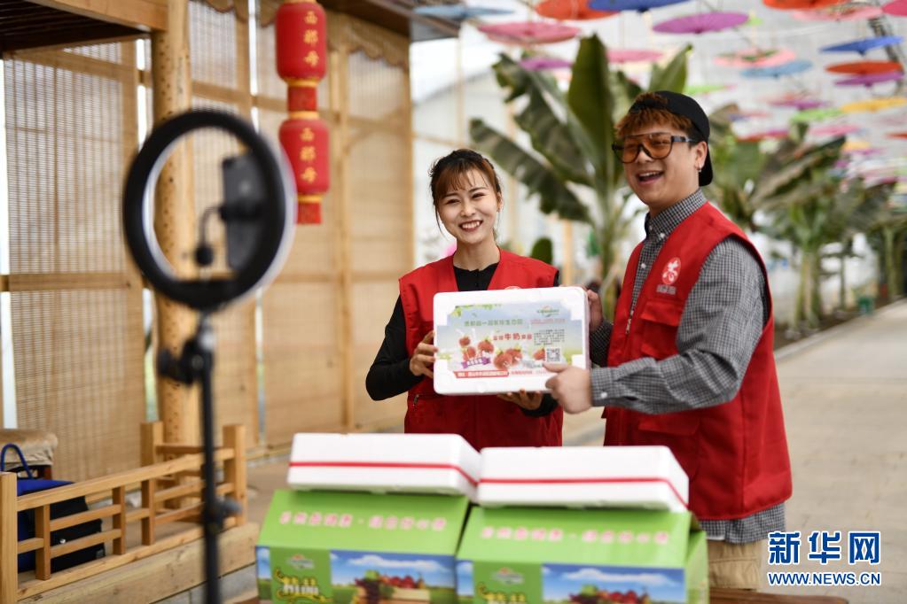 5月11日,工作人員在河北省唐山市豐潤區(qū)西那母生態(tài)旅游度假村內(nèi)通過網(wǎng)絡(luò)直播的形式推介草莓。新華社記者 牟宇 攝