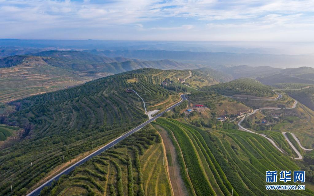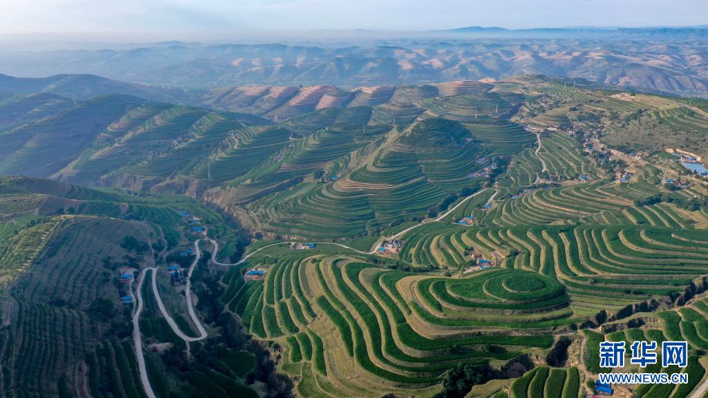 這是7月14日在寧夏固原市彭陽(yáng)縣拍攝的青云灣旱作梯田公園(無(wú)人機(jī)照片)。新華社記者 馮開(kāi)華 攝
