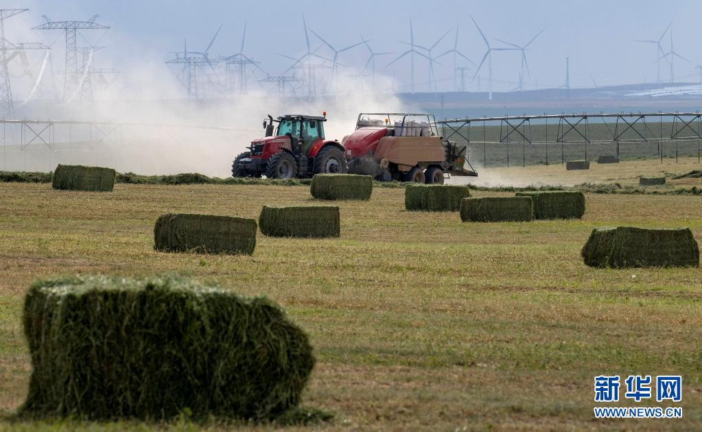 在寧夏鹽池縣馮記溝鄉(xiāng)平臺(tái)村的優(yōu)質(zhì)牧草基地,農(nóng)戶用機(jī)械將牧草打捆(7月14日攝)。新華社記者 楊植森 攝