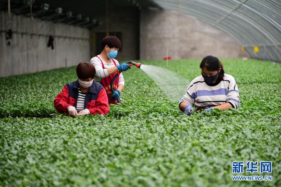 河北曲周縣一家育苗產(chǎn)業(yè)基地的工人在育苗溫棚內(nèi)工作(5月4日攝)。曲周縣積極拓寬產(chǎn)業(yè)扶貧渠道,發(fā)揮當?shù)禺a(chǎn)業(yè)優(yōu)勢,統(tǒng)籌協(xié)調(diào)貧困戶利用扶貧資金入股現(xiàn)代設(shè)施農(nóng)業(yè)基地,帶動群眾脫貧增收。新華社記者 朱旭東 攝