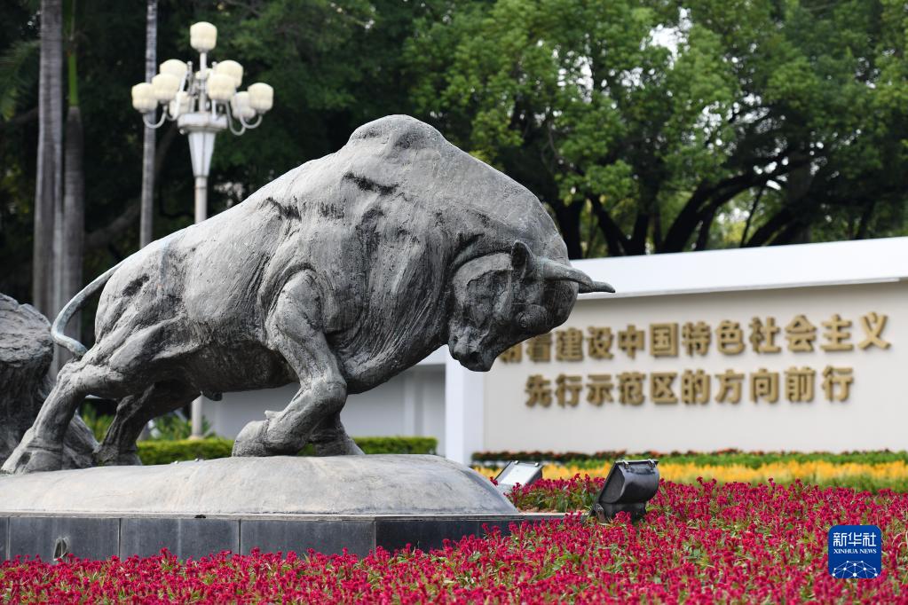 這是深圳深南大道的“拓荒牛”雕像(2020年10月12日攝)。新華社記者 梁旭 攝