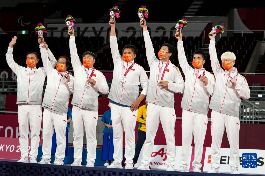 9月3日,摘得銀牌的中國隊(duì)在東京殘奧會(huì)男子盲人門球頒獎(jiǎng)儀式上。新華社記者 張鋮 攝