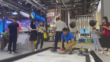 在奧地利展廳,一個小型冰壺場吸引眾人關(guān)注,不時有參觀者體驗。