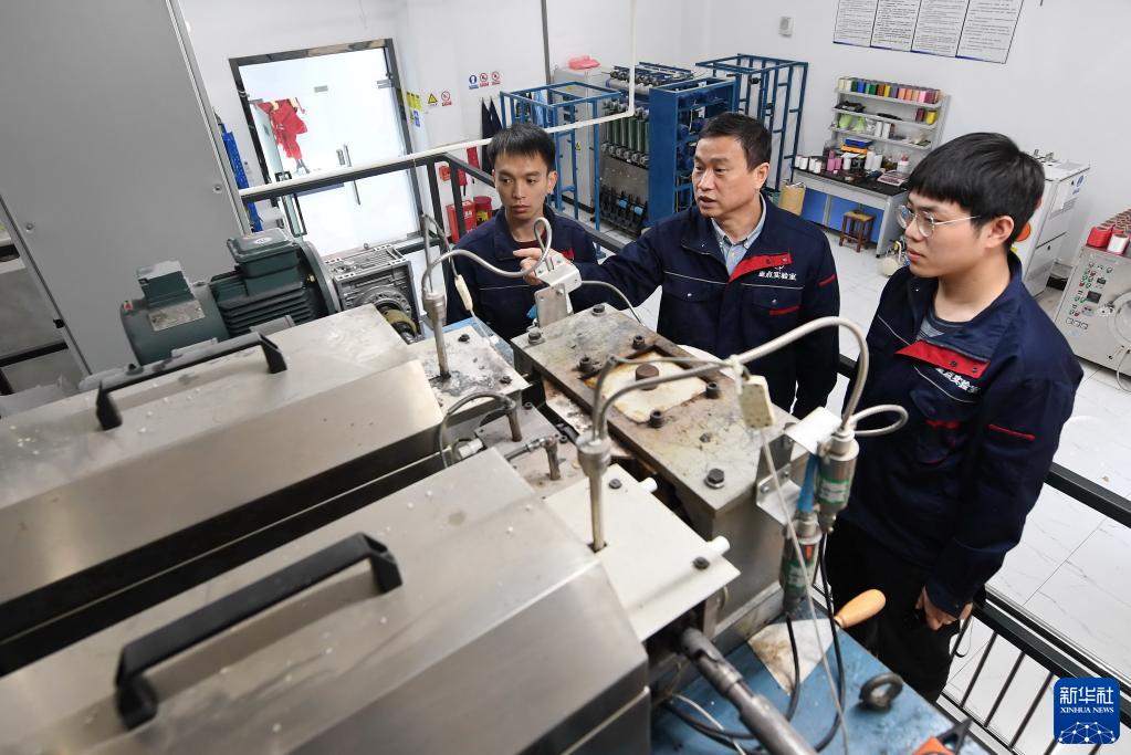 福建閩江學(xué)院服裝與藝術(shù)工程學(xué)院教授李永貴(中)在“福建省新型功能性紡織纖維及材料重點實驗室”教學(xué)生做紡絲實驗(3月22日攝)。新華社記者 林善傳 攝