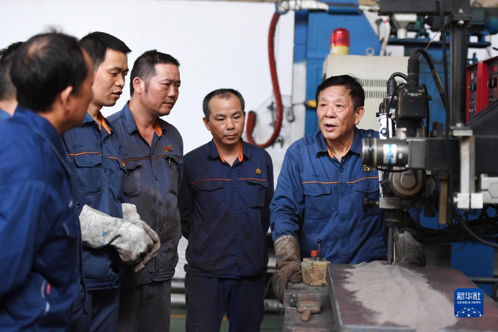 6月17日,艾愛國(guó)(左一)在湖南湘潭湘鋼高級(jí)技工學(xué)校焊接實(shí)習(xí)基地檢查學(xué)生的焊接作業(yè)。新華社記者 薛宇舸 攝