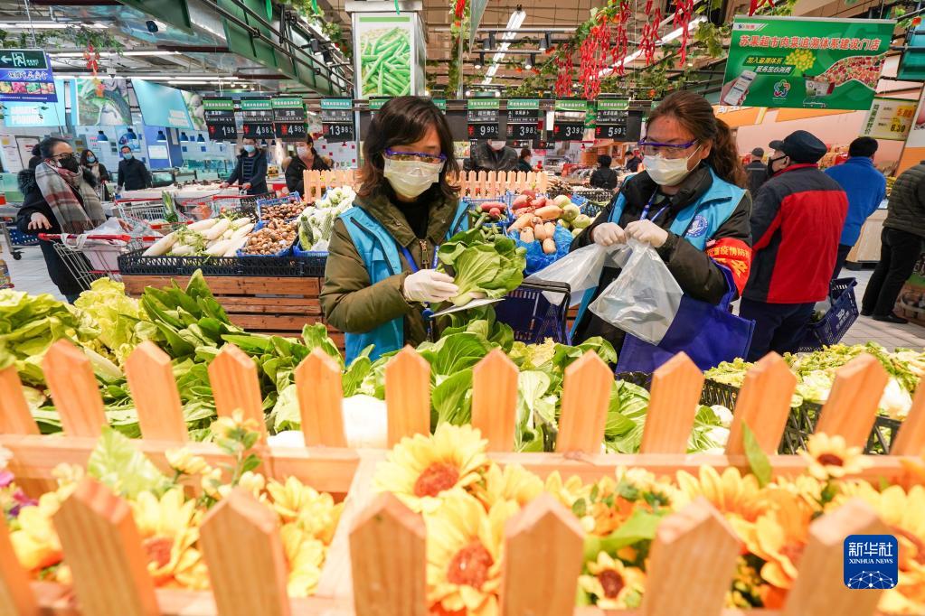 南京市建鄴區(qū)南苑街道興達社區(qū)的網(wǎng)格長范璐(左)和同事在超市為轄區(qū)內(nèi)居民代購蔬菜(2020年2月17日攝)。新華社記者 李博 攝