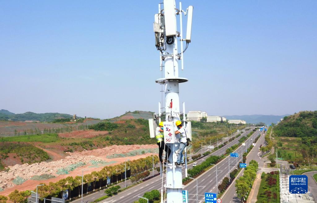 工作人員在位于重慶高新區(qū)高新大道的5G基站建設(shè)現(xiàn)場作業(yè)(2020年4月15日攝,無人機照片)。新華社記者 王全超 攝