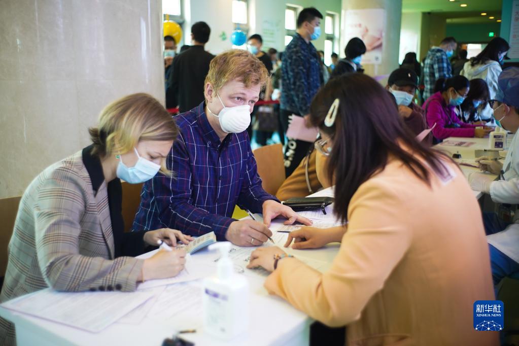 4月15日,在位于北京經(jīng)濟開發(fā)區(qū)的一處新冠疫苗接種點,外籍人士接種新冠疫苗前填寫個人信息。新華社記者 彭子洋 攝