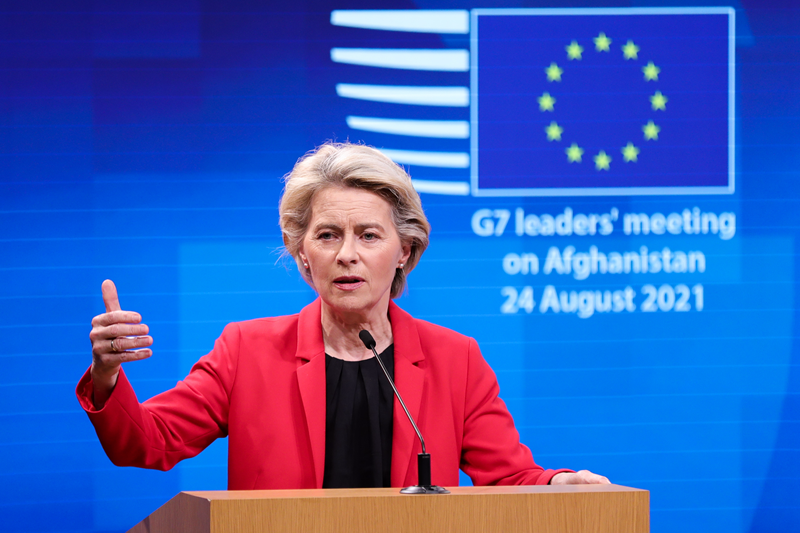 8月24日,在比利時(shí)布魯塞爾,歐盟委員會(huì)主席馮德萊恩在記者會(huì)上發(fā)言。(新華社記者鄭煥松攝)