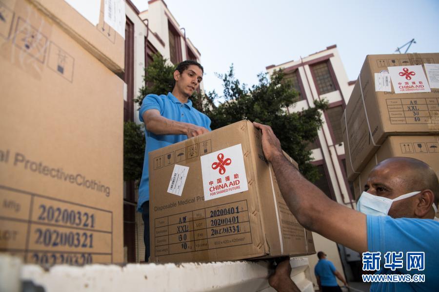 5月10日,在埃及首都開羅,工作人員搬運中國政府援助的第二批抗疫物資。新華社記者 鄔惠我 攝