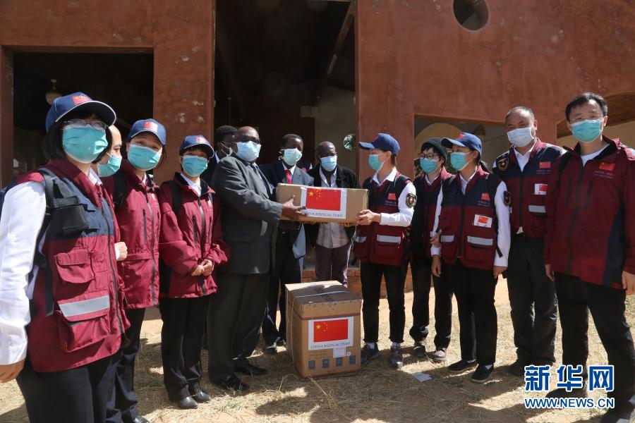 5 月 19 日,在津巴布韋中馬紹納蘭省的姆武爾維醫(yī)院,中國抗疫醫(yī)療專家組為當(dāng)?shù)蒯t(yī)療機構(gòu)捐贈醫(yī)療物資。新華社記者 張玉亮 攝