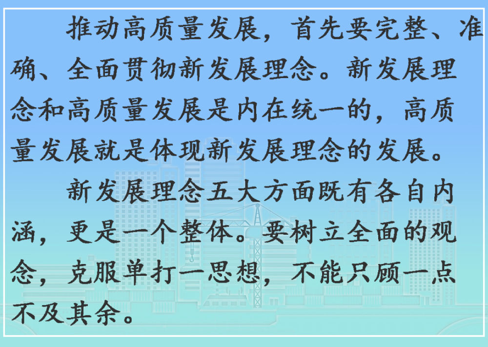 黨的十九屆六中全會審議通過的《中共中央關于黨的百年奮斗重大成就和歷史經驗的決議》指出:“黨中央強調,貫徹新發(fā)展理念是關系我國發(fā)展全局的一場深刻變革,不能簡單以生產總值增長率論英雄,必須實現(xiàn)創(chuàng)新成為第一動力、協(xié)調成為內生特點、綠色成為普遍形態(tài)、開放成為必由之路、共享成為根本目的的高質量發(fā)展,推動經濟發(fā)展質量變革、效率變革、動力變革?!?/span>