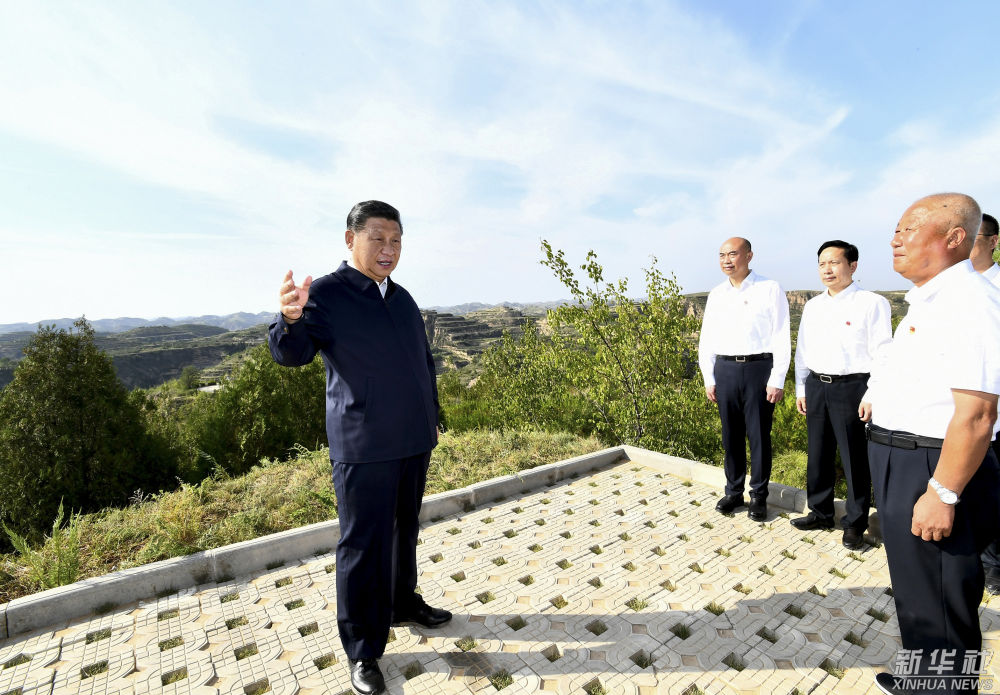 ↑2021年9月13日下午,習近平在陜西省榆林市米脂縣銀州街道高西溝村龍頭山山頂,考察黃土丘陵溝壑區(qū)綜合治理情況。