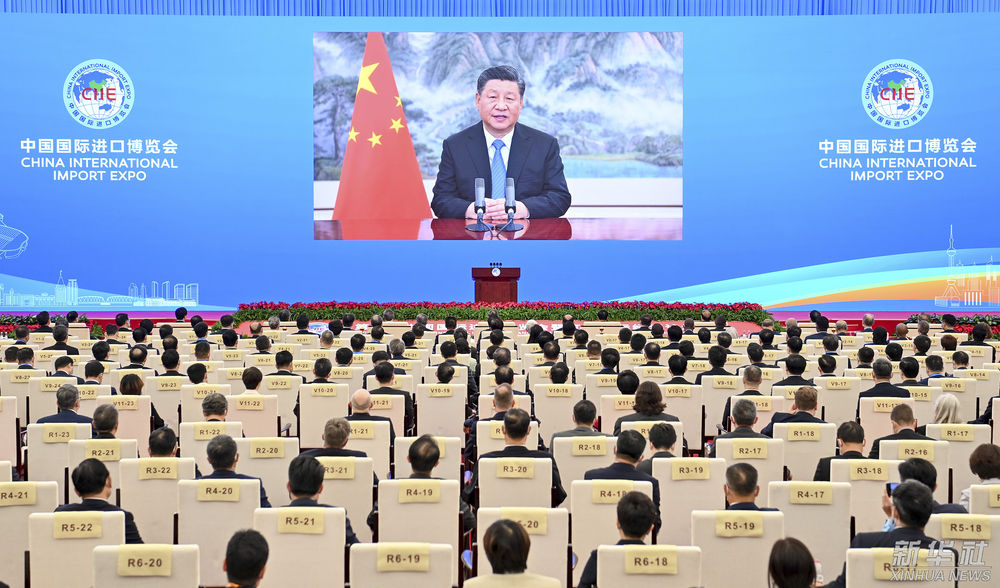 ↑2021年11月4日晚,習近平以視頻方式出席第四屆中國國際進口博覽會開幕式并發(fā)表題為《讓開放的春風溫暖世界》的主旨演講。