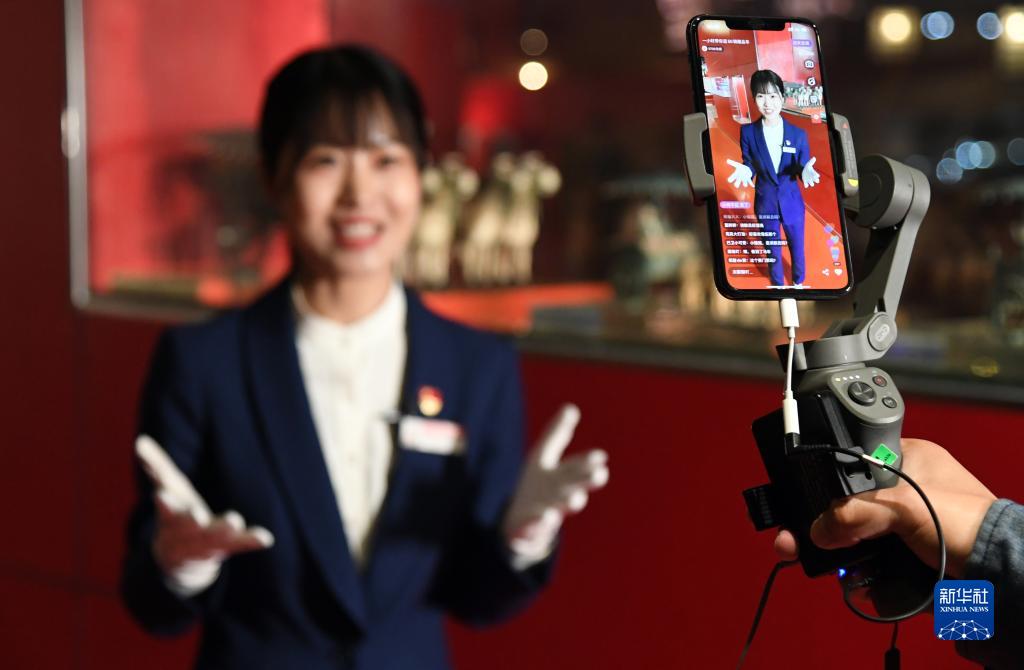 2020年4月30日,在北京汽車博物館,講解員曾紅娟通過網(wǎng)絡(luò)直播平臺為觀眾介紹館內(nèi)的藏品車。新華社記者 任超 攝