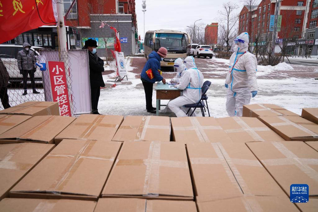 在黑龍江省黑河市愛輝區(qū)一小區(qū),社區(qū)工作人員為居民發(fā)放免費生活物資(11月10日攝)。新華社記者 王松 攝