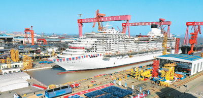 日前,中國首制大型郵輪在中國船舶集團(tuán)旗下上海外高橋造船有限公司船塢內(nèi)順利實(shí)現(xiàn)塢內(nèi)起浮。這是大型郵輪建造的重要節(jié)點(diǎn),標(biāo)志著該項(xiàng)目向著完工交付的總目標(biāo)邁出關(guān)鍵一步。去年末,中國船舶集團(tuán)總部由北京遷往上海。本報記者 沈文敏攝