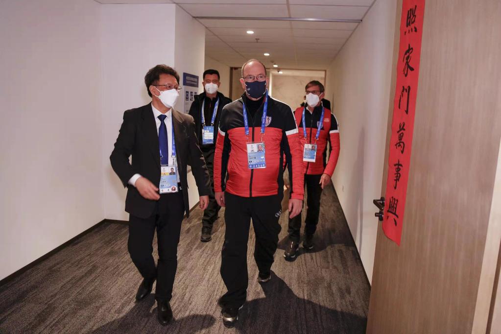 阿爾貝二世親王(前右)來(lái)到新華社冬奧前方報(bào)道中心
