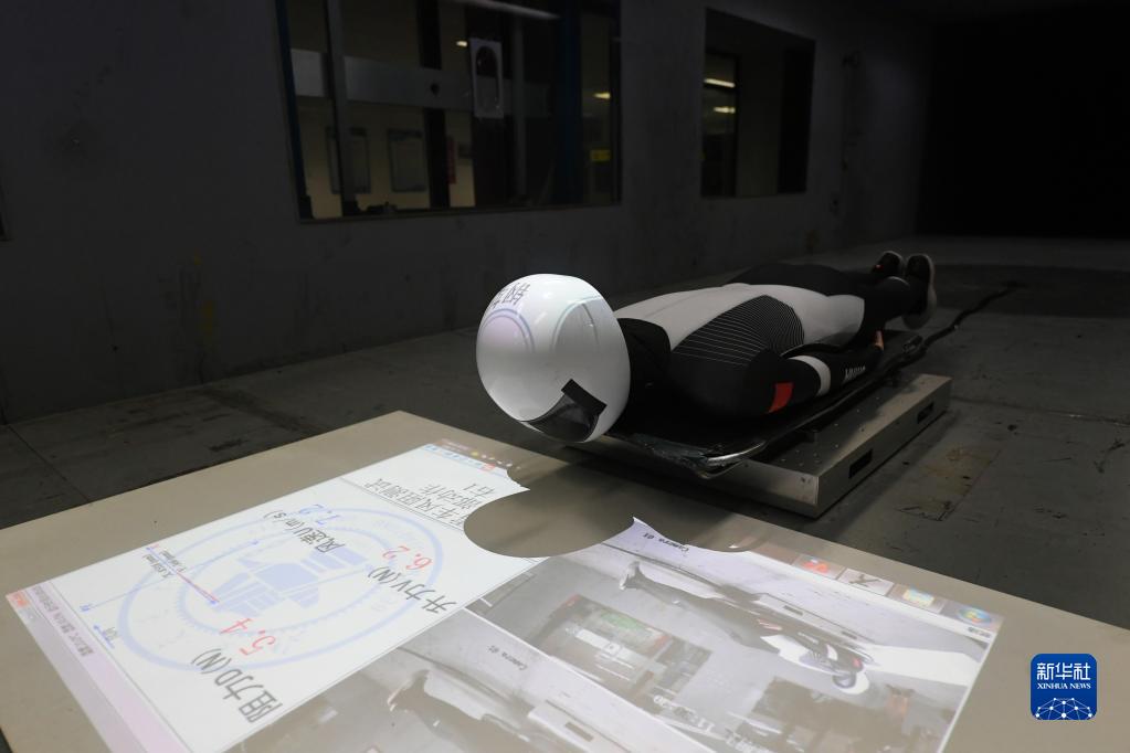 在北京交通大學(xué)風(fēng)洞實(shí)驗(yàn)室,風(fēng)洞輔助訓(xùn)練系統(tǒng)顯示的信息將運(yùn)動速度、運(yùn)動風(fēng)阻力、運(yùn)動姿態(tài)及測試指令實(shí)時反饋給測試人員(2021年7月16日攝)。新華社記者 任超 攝
