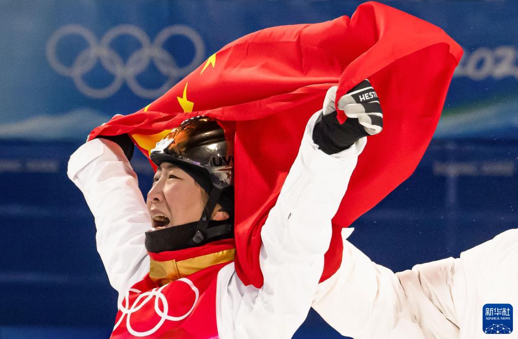 2月14日,中國選手徐夢桃在比賽后慶祝。當(dāng)日,北京2022年冬奧會自由式滑雪女子空中技巧決賽在張家口云頂滑雪公園舉行,中國選手徐夢桃奪得冠軍。新華社記者 肖藝九 攝