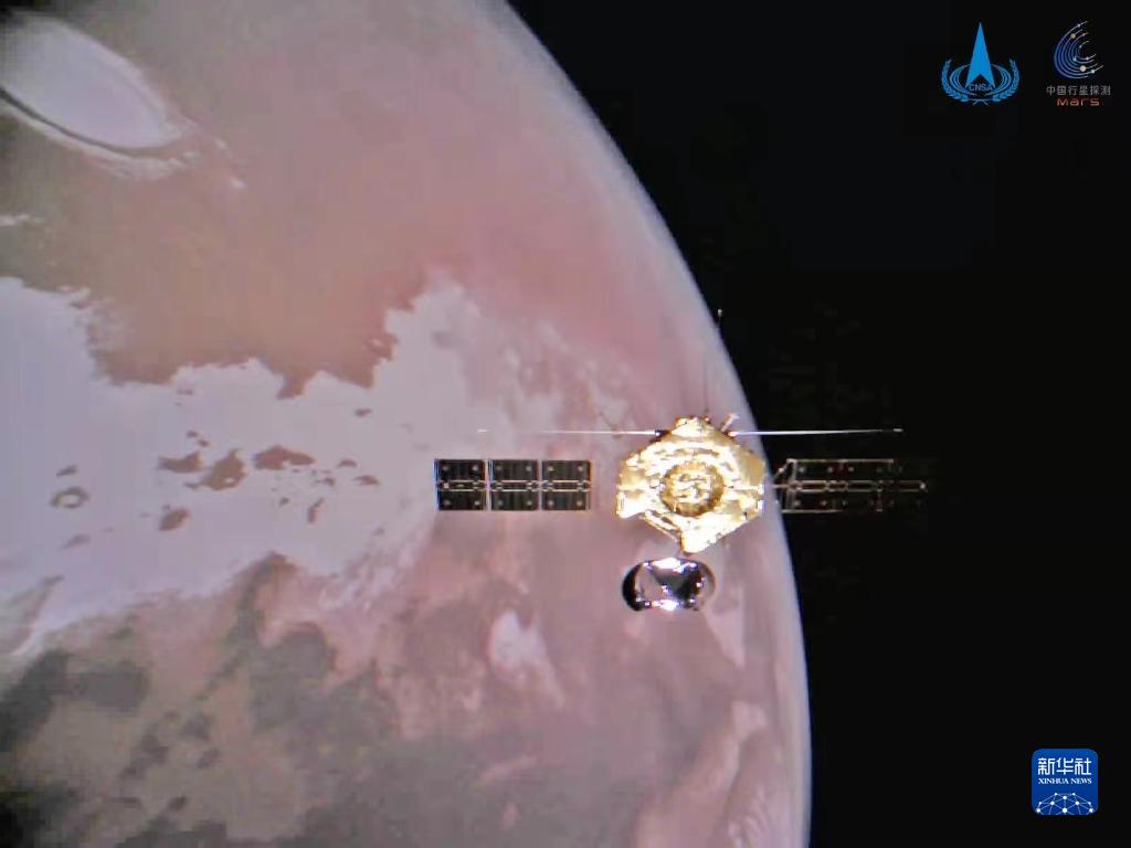 2022年元旦,國家航天局發(fā)布我國首次火星探測任務天問一號探測器從遙遠火星傳回的一組精美圖像,向全國人民報告平安。這是環(huán)繞器與火星合影。新華社發(fā)(國家航天局供圖)