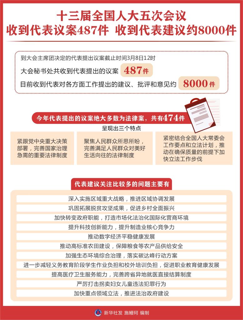據(jù)了解,經(jīng)梳理分析,今年代表提出的議案絕大多數(shù)為法律案,共有474件,呈現(xiàn)出三個特點(diǎn)。一是緊跟黨中央重大決策部署,完善國家治理急需的重要法律制度。代表們提出了制定突發(fā)公共衛(wèi)生事件應(yīng)對法、糧食安全保障法、能源法以及碳達(dá)峰碳中和、數(shù)字經(jīng)濟(jì)、大數(shù)據(jù)、社會信用等方面法律的議案。二是聚焦人民群眾所思所盼,完善滿足人民群眾對美好生活向往的法律制度。代表們提出了制定學(xué)前教育法、社會救助法、反電信網(wǎng)絡(luò)詐騙法以及托育服務(wù)、養(yǎng)老服務(wù)等方面法律,修改職業(yè)教育法、婦女權(quán)益保障法等法律的議案,以法治方式推動解決人民群眾反映較多的民生領(lǐng)域突出問題。三是緊密結(jié)合全國人大常委會工作要點(diǎn)和立法計(jì)劃,推動在確保質(zhì)量的前提下加快立法工作步伐。代表們提出了制定農(nóng)村集體經(jīng)濟(jì)組織法、民事強(qiáng)制執(zhí)行法、黑土地保護(hù)法,修改公司法、反壟斷法、企業(yè)破產(chǎn)法、治安管理處罰法等法律的議案,這些立法項(xiàng)目都已納入了今年常委會的重點(diǎn)工作安排。此外,代表們還提出了修改刑法、啟動條件成熟領(lǐng)域法典編纂的議案。