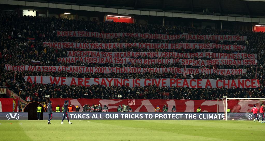 3月17日,在塞爾維亞首都貝爾格萊德舉行的一場足球比賽中,塞爾維亞觀眾拉起多條橫幅,細數(shù)美國、北約過去幾十年來轟炸或挑起戰(zhàn)爭的國家和地區(qū)名單,并高唱反戰(zhàn)歌曲,以此諷刺西方在“反戰(zhàn)”方面的雙重標準。(新華社發(fā),普雷德拉格·米洛薩夫列維奇攝)