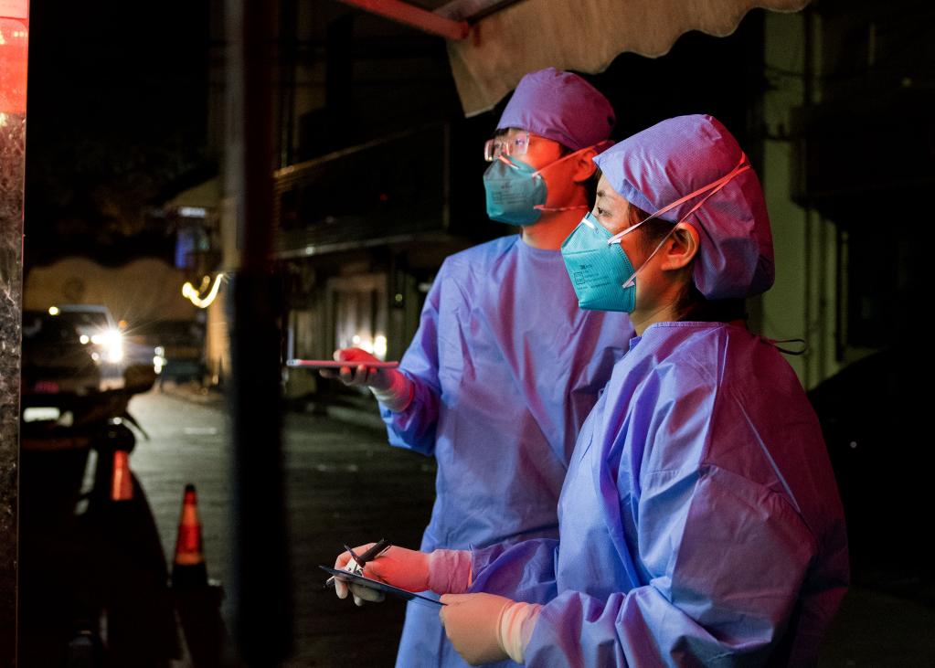 3月16日晚,流調(diào)人員在進行軌跡排查。新華社記者劉穎攝