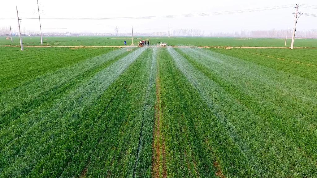 河北寧晉縣高效農(nóng)田示范區(qū)內(nèi)的麥田進行節(jié)水澆灌(無人機照片)。(朱麗娜攝)