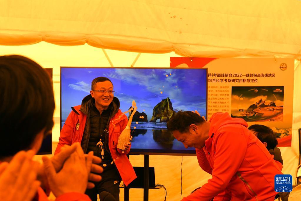 當日凌晨3點,科考隊員從珠峰海拔8300米的突擊營地開始沖頂。他們在海拔8830米處,架設了世界海拔最高自動氣象站,并在8848.86米的巔峰,利用高精度雷達測量冰雪厚度。任務一個接一個順利完成,珠峰大本營“巔峰使命”總指揮會議室?guī)づ窭?,見證這一盛舉的科學家和工作人員的掌聲、喝彩聲,一次比一次響亮。