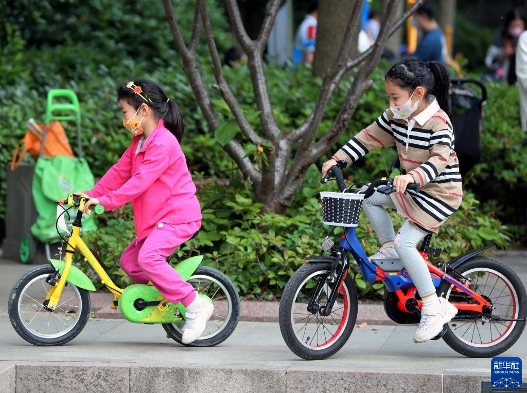 5月17日,在上海市松江區(qū),小朋友們?cè)隍T自行車。新華社記者 劉穎 攝