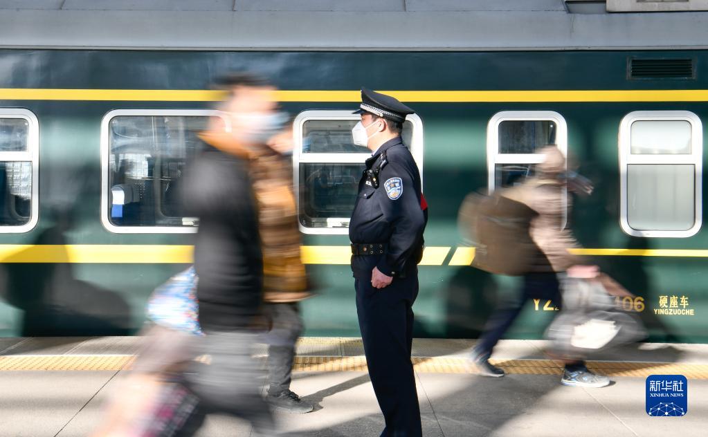 北京鐵路公安局天津鐵路公安處乘警支隊(duì)四大隊(duì)民警高天順在天津站執(zhí)勤(2021年2月3日攝)。新華社記者 孫凡越 攝