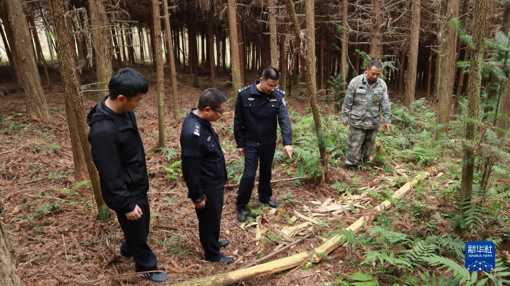 福建省南平市浦城縣公安局石陂森林派出所所長郭曉強(qiáng)(右二)在盜伐林木案件現(xiàn)場分析作案動(dòng)機(jī)(2020年12月11日攝)。新華社記者 趙雪彤 攝