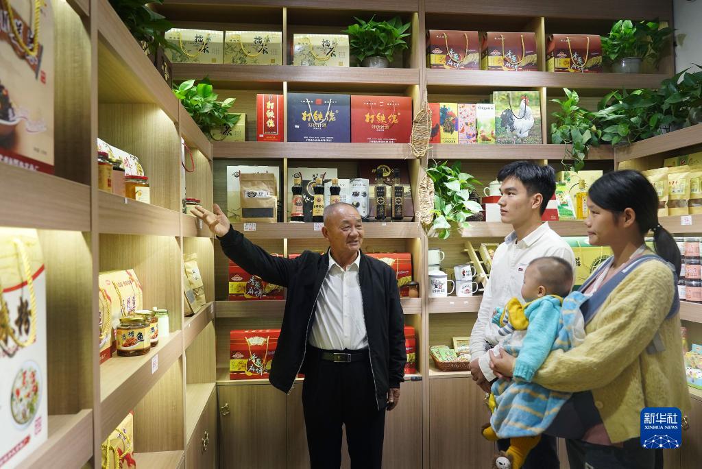 2020年10月21日,江西省贛州市于都縣梓山鎮(zhèn)潭頭村村民孫觀發(fā)(左一)向游客介紹當(dāng)?shù)氐奶厣r(nóng)產(chǎn)品。 新華社記者 萬象 攝
