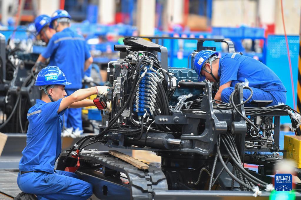 在位于長沙經開區(qū)的一家智能裝備公司,工作人員在組裝機械裝備(2022年7月1日攝)。新華社記者 陳澤國 攝