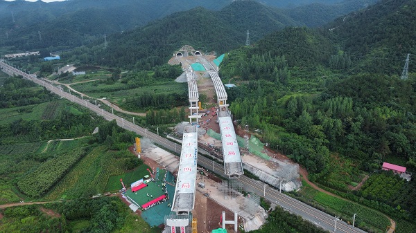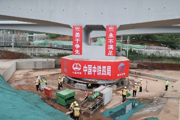 據(jù)悉,由中鐵四局承建的澠淅高速跨浩吉鐵路轉(zhuǎn)體梁全長140米,橋面寬13米,主墩高5米,是澠淅高速的控制性工程之一。該轉(zhuǎn)體梁是國內(nèi)為數(shù)不多的雙幅跨鐵路曲線梁,且距離鐵路線僅有8米,施工難度大,安全隱患多,安全卡控要求嚴(yán)。為實現(xiàn)精準(zhǔn)對接,項目部分別在2個T構(gòu)主墩安裝千斤頂和液壓泵,同步順時針轉(zhuǎn)體44.5°和42.3°。在歷經(jīng)正常轉(zhuǎn)動、減速轉(zhuǎn)動、點動轉(zhuǎn)動三個階段后,歷時100分鐘精確完成轉(zhuǎn)體。