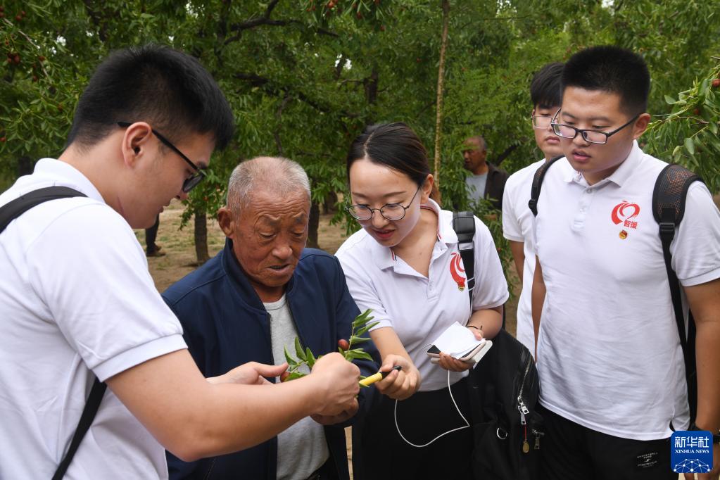 中國海洋大學(xué)紅旗智援博士團(tuán)成員在山東省樂陵市朱集鎮(zhèn)大常村棗林向果農(nóng)了解果樹種植情況(2019年9月19日攝)。新華社記者 李紫恒 攝