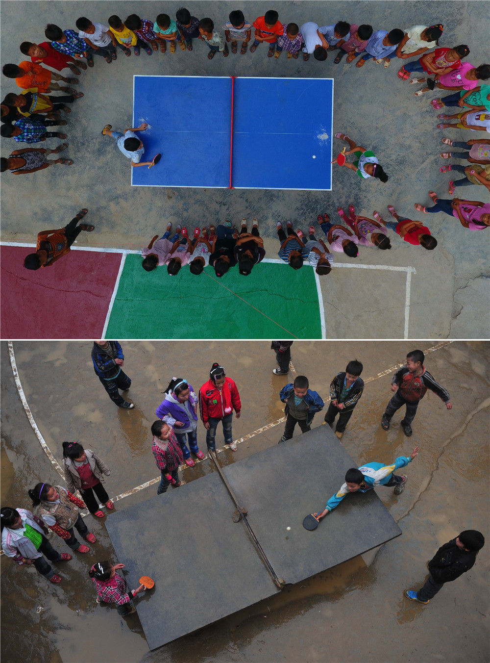 拼版照片:上圖為在廣西大化瑤族自治縣板升鄉(xiāng)弄勇小學,孩子們在打乒乓球(2017年9月4日攝,無人機照片);下圖為在弄勇小學,孩子們在打乒乓球(2012年12月26日攝)。新華社記者 黃孝邦 攝