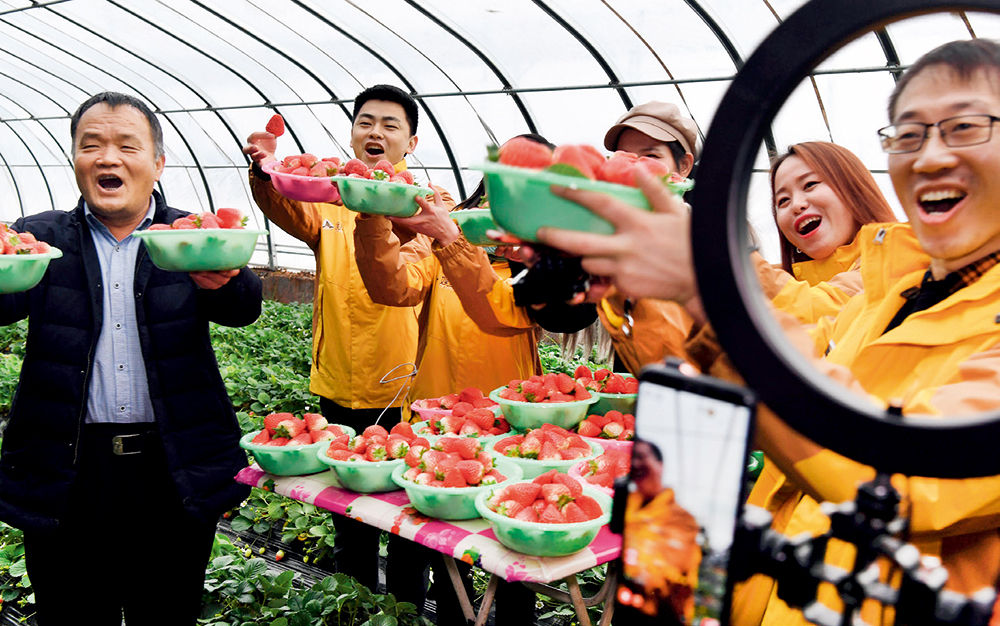 ▲ 一家電商平臺工作人員在陜西省合陽縣金峪鎮(zhèn)溝北現(xiàn)代農(nóng)業(yè)科技示范區(qū)直播推廣草莓(2020年1月10日攝) 陶明攝