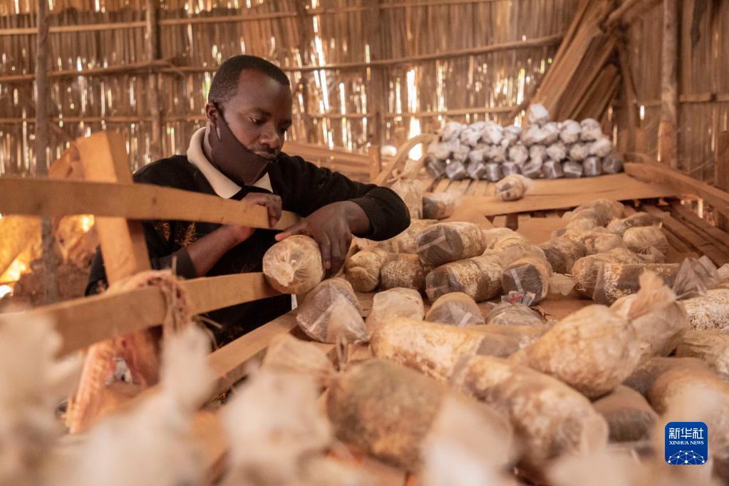在盧旺達首都基加利的一家食用菌培育作坊,作坊主人埃馬紐埃爾·阿希馬納檢查菌袋(2020年9月9日攝)。中國福建農林大學的菌草專家2006年來到盧旺達開始菌草技術合作項目,在當?shù)厥痉逗屯茝V菌草技術。新華社發(fā)(西里爾·恩德格亞攝)