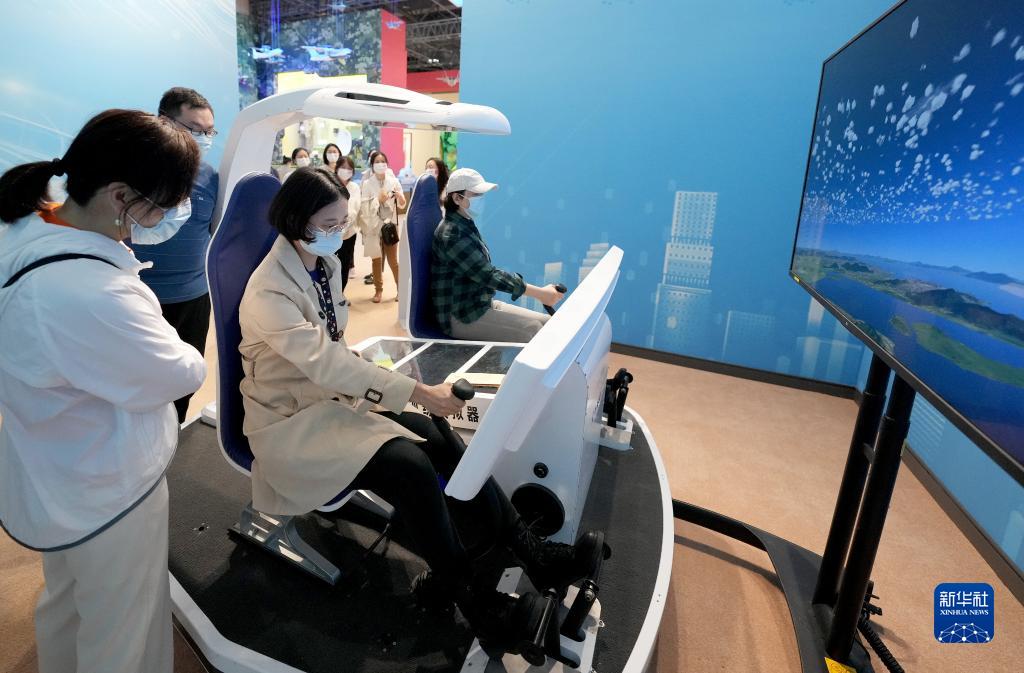 10月7日,觀眾在“奮進(jìn)新時代”主題成就展上體驗(yàn)操縱直升機(jī)訓(xùn)練模擬器。當(dāng)日是國慶長假的最后一天,大批觀眾來到北京展覽館參觀“奮進(jìn)新時代”主題成就展。新華社記者 王毓國 攝