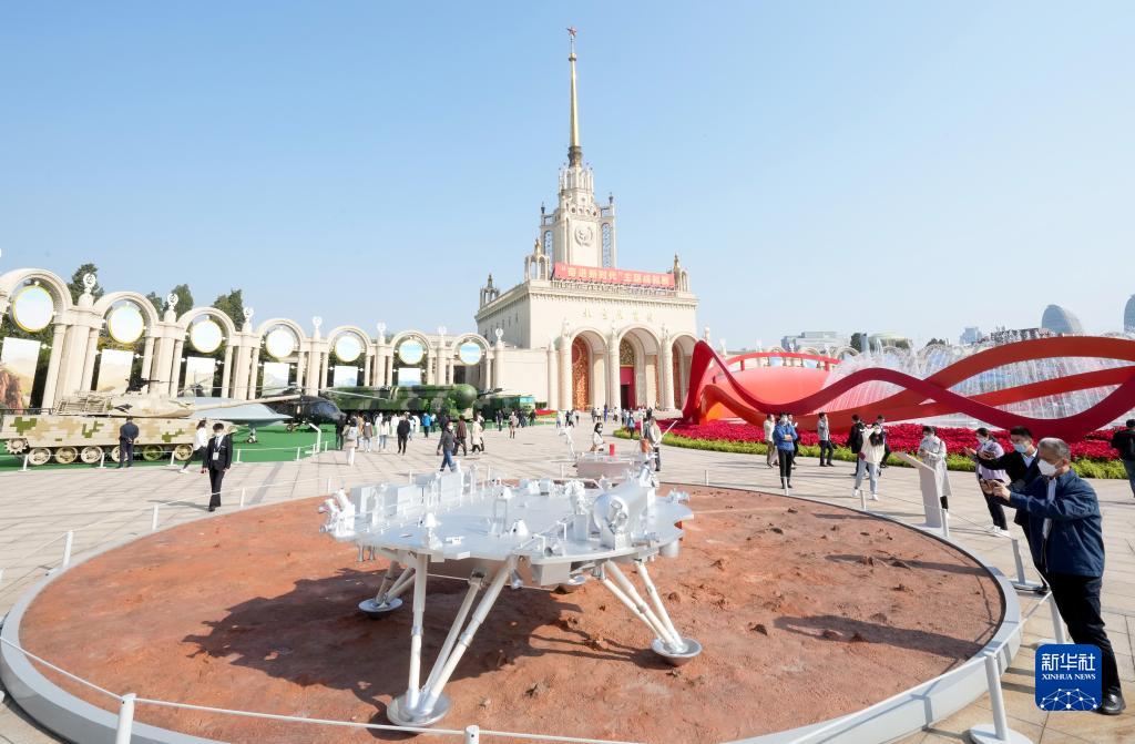 10月7日,觀眾在“奮進(jìn)新時代”主題成就展上參觀天問一號著陸器模型。當(dāng)日是國慶長假的最后一天,大批觀眾來到北京展覽館參觀“奮進(jìn)新時代”主題成就展。新華社記者 王毓國 攝