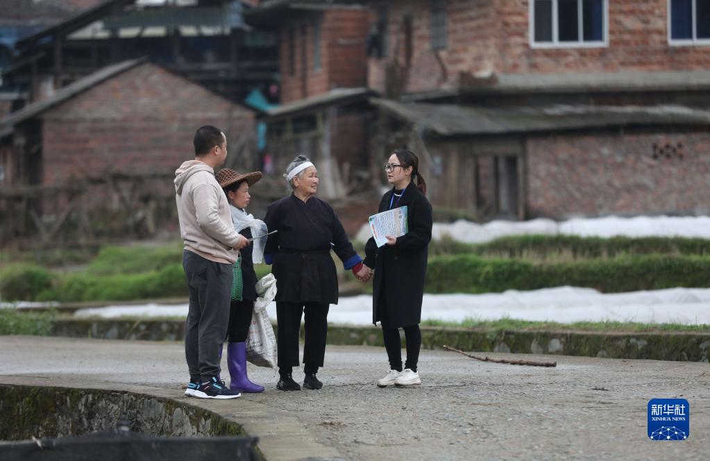 在廣西柳州市三江侗族自治縣良口鄉(xiāng)南寨村,紀檢監(jiān)察干部(右一、左一)在了解惠農政策落實情況(2022年3月24日攝)。新華社記者 黃孝邦 攝